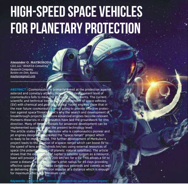 АННОТАЦИЯ I Важнейшей задачей космонавтики считается защита от астероидно-кометных атак. Однако уровень развития космонавтики не соответствует ожиданиям теоретиков. Наблюдаемые научно-технические тренды развития космического транспорта с ракетными химическими двигателями и возможными ядерными не свидетельствуют о скором превращении космонавтики в эффективного защитника от космических угроз. В связи с этим становятся актуальными поиск и развитие прорывных проектов с более совершенными двигателями. В этом направлении пионеры-теоретики космонавтики оставили большой задел. При нынешнем уровне развития техники многие из их перспективных предложений могут быть успешно реализованы. В статье показывается, что к таким важным разработкам, дозревшим до воплощения, относится проект космического воздушно-реактивного двигателяпионера космонавтики и конструктора реактивных двигателей И.А. Меркулова. Дальнейшее развитие проекта Меркулова ведет к созданию реактивного двигателя прямоточного типа, который, используя внешние ресурсы космоса (потенциальную энергию вещества естественных спутников планет), способен разгонять космические аппараты (КА) до скорости в десятки и сотни километров в секунду. Показывается, что использование в качестве ресурсной базы системы спутников Юпитера обеспечит разгон КА до скорости более 200 км/с. При такой скорости КА пересекают расстояние, равное радиусу орбиты Юпитера, за 45 суток, что обеспечивает эффективную скорость реакции на опасные астероиды и кометы и передачу им отклоняющего импульса на таком расстоянии, где обеспечивается максимальный эффект при минимальных затратах.